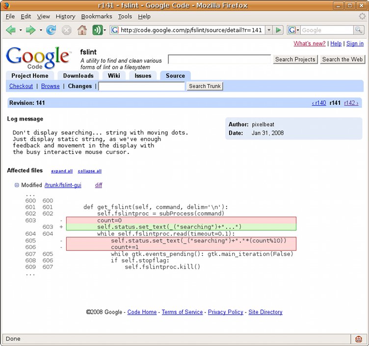 Recently Jenan Wise from google added a changeset viewer to their project hosting web interface. Coincidentally the "Colored Diffs" project mentioned above is hosted on Google Code, so you can view its latest changes as an example. The screenshot below shows the representation of a particular change, where a summary of the diff is shown, and one can drill down further to get a full side by side file comparison of the change.